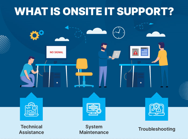 Khi một tổ chức gặp phải vấn đề hoặc sự cố liên quan đến hệ thống máy tính, mạng, phần mềm hoặc các thiết bị IT khác, nhân viên IT Onsite sẽ đến trực tiếp địa điểm làm việc của người dùng cuối (người dùng máy tính) để giải quyết vấn đề. Họ cung cấp hỗ trợ và giải đáp các câu hỏi về sử dụng, cấu hình và sửa chữa các thiết bị và phần mềm.